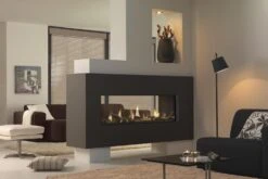 Auf einer Gesamtbreite von 170,8 cm mit zwei Panoramascheiben von 149,2 × 39,0 cm fasziniert das Spiel der Flammen Beobachter von beiden Seiten. Die Innenauskleidung dieses Gaskamins ist in Schwarz glatt gehalten. Für den Feuerraum können statt braunen Holzscheit-Imitaten auch weiße Birkenholz-Imitate, graue Greystone-Steine oder weiße Carrara-Steine als Einlage geliefert werden.