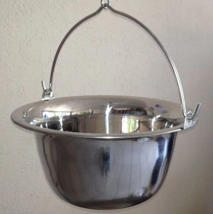 Er ist zu hundert Prozent aus Edelstahl und hat ein Fassungsvermögen von bis zu 6 Litern. Der Topf wird in einem extra stabilen Ring eingehängt und kann durch den Henkel einfach und bequem wieder entnommen werden.