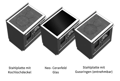 - Herdplatte wahlweise als 8 mm Stahlfeld oder 4 mm Ceranfeld