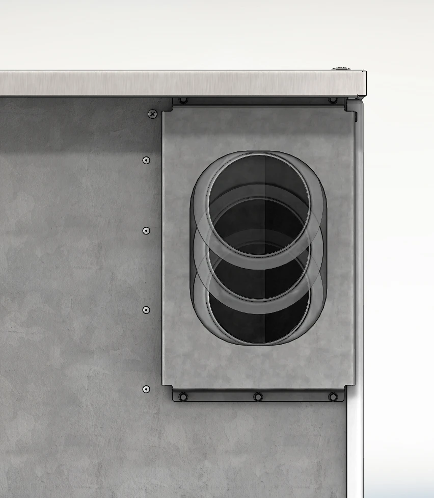 Durch dieses lässt sich wunderbar das Spiel der Flammen beobachten. Für klare Sicht sorgt dabei die praktische Scheibenspülluft, die entlang der Sichtscheibe strömt. Der Rauchrohranschluss mit einem Durchmesser von 120 mm kann links oder rechts, seitlich, hinten und oben erfolgen und eignet sich auch für Mehrfachbelegung. Bei Auswahl eines Ceranfeldes ist ein Rauchrohranschluss im oberen Bereich allerdings nicht möglich.