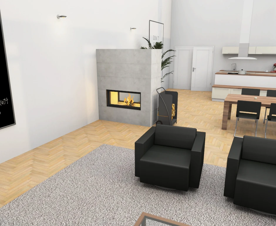 Durch eine geschickte Positionierung im Aufstellraum kann die Kaminanlage stilvoll als Raumtrenner eingesetzt werden. Die Oberfläche des Architektur-Kamins kann in ihrer natürlichen Betonoptik belassen werden, oder individuell gestaltet werden. Mit Putz, Farbe oder Großkeramikteilen stehen Ihnen hier allerlei Varianten zur Verfügung.