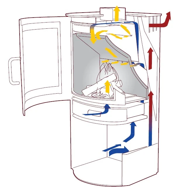 Das Zweikammer-Brennsystem arbeitet mit vorgewärmter Verbrennungsluft und ist dadurch besonders leistungsstark. Bei 5 kW Nennwärmeleistung erreicht der Ofen einen Wirkungsgrad von über 83 % und ist für die Beheizung kleiner und größerer Aufstellräume mit 30 bis 100 m² Grundfläche optimal ausgelegt.