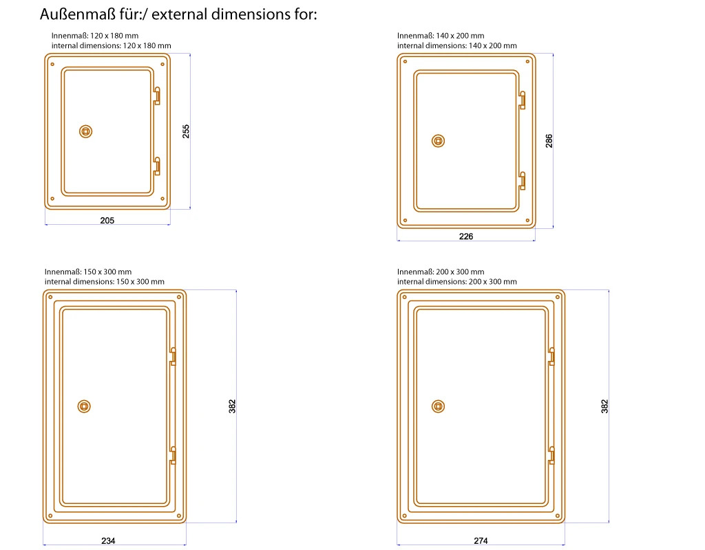 aus hochwertigen V4A- Edelstahl in verschiedenen Maßen (siehe oben) zur Reinigung und Kontrolle der Schornsteinanlage.