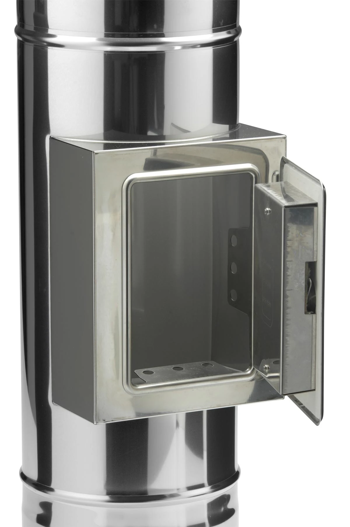Doppelwandige Prüföffnung aus hochwertigen V4A Edelstahl in wählbaren Querschnitten 113-400 mm in der Materialstärke: Innenschale 1 mm, Außenschale 0,6 mm in 50 mm Wärmedämmung zum Reinigen und zur Kontrolle der Schornsteinanlage.