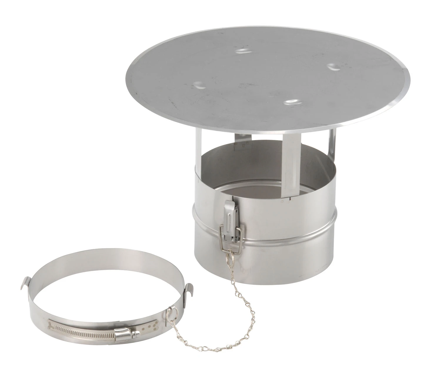 Einwandige Regenhaube mit Klemmschelle aus hochwertigen V4A Edelstahl in wählbaren Querschnitten 80 – 400 mm in der Materialstärke: 0,6 mm (1,0 mm auf Anfrage).