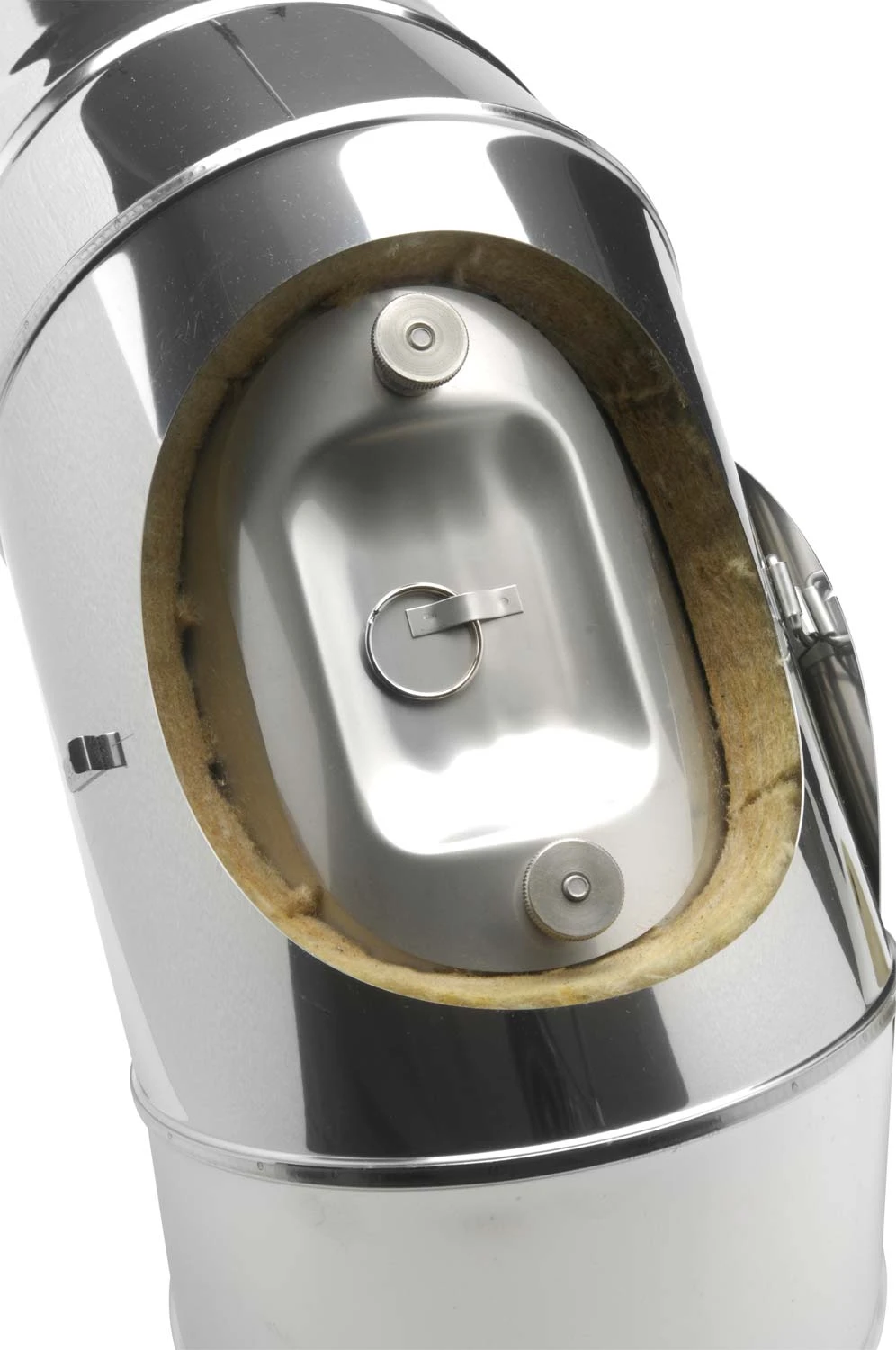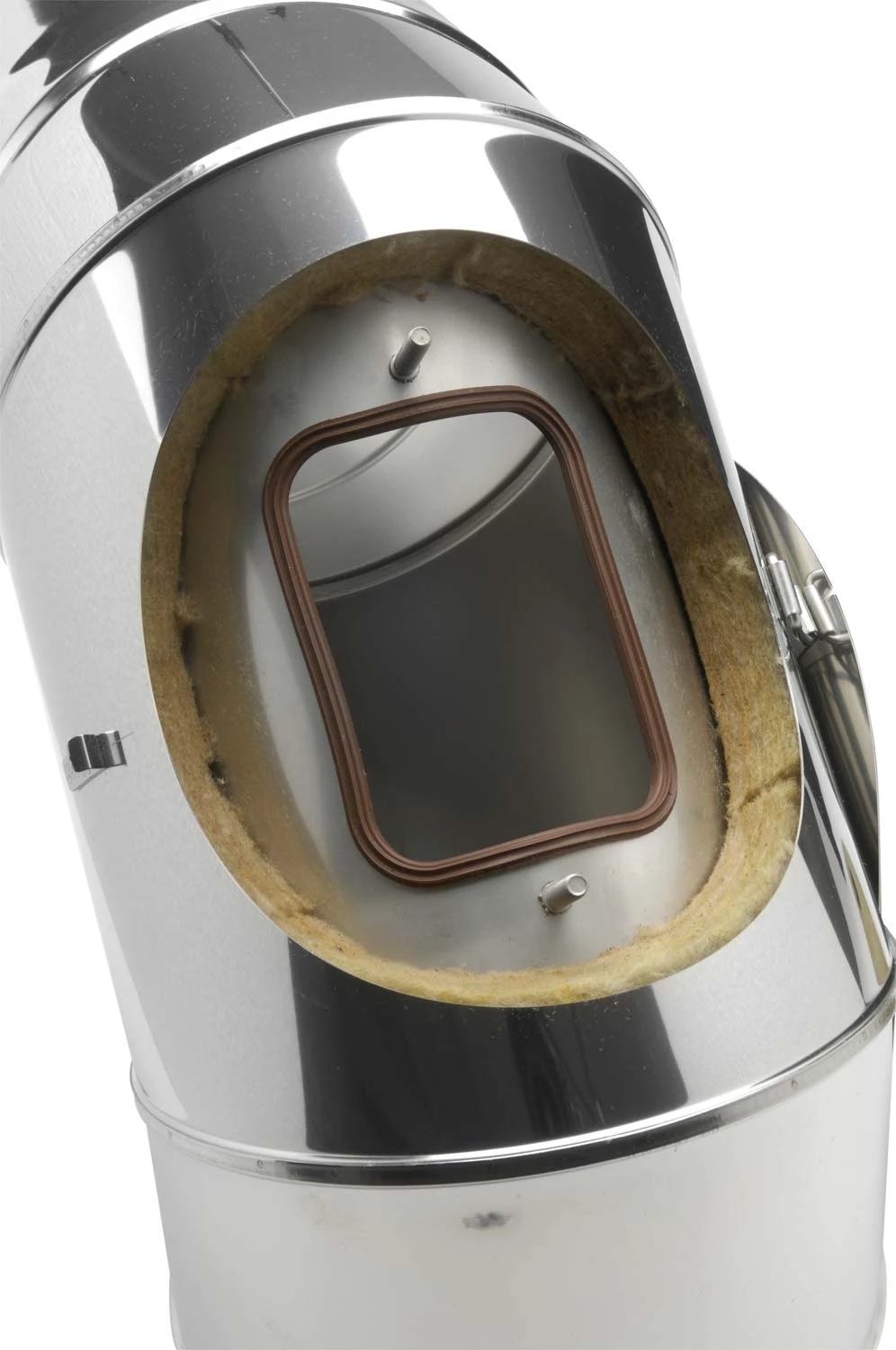 Doppelwandiger Edelstahlbogen in wählbaren Querschnitten 113 – 400 mm mit Prüföffnung aus hochwertigen V4A Edelstahl in der Materialstärke: 0,6 mm (1,0 mm auf Anfrage) in 25 mm Wärmedämmung (siehe oben) zur Schrägführung der Schornsteinanlage.