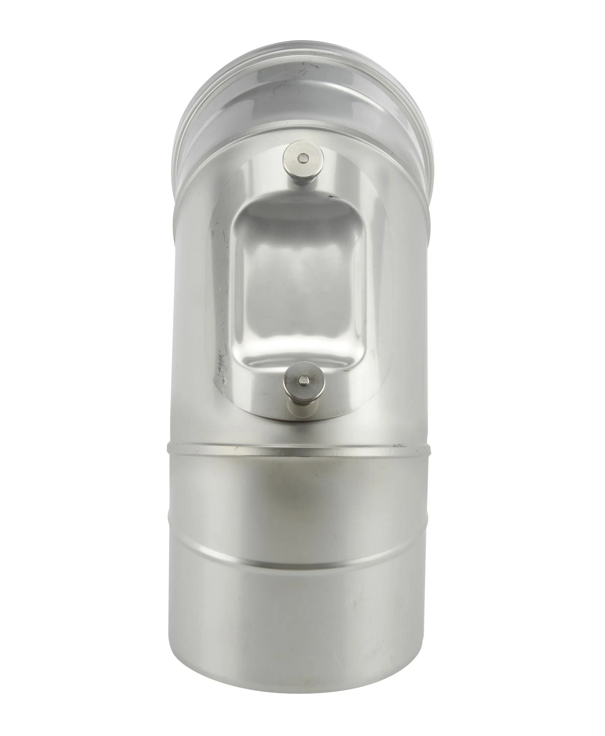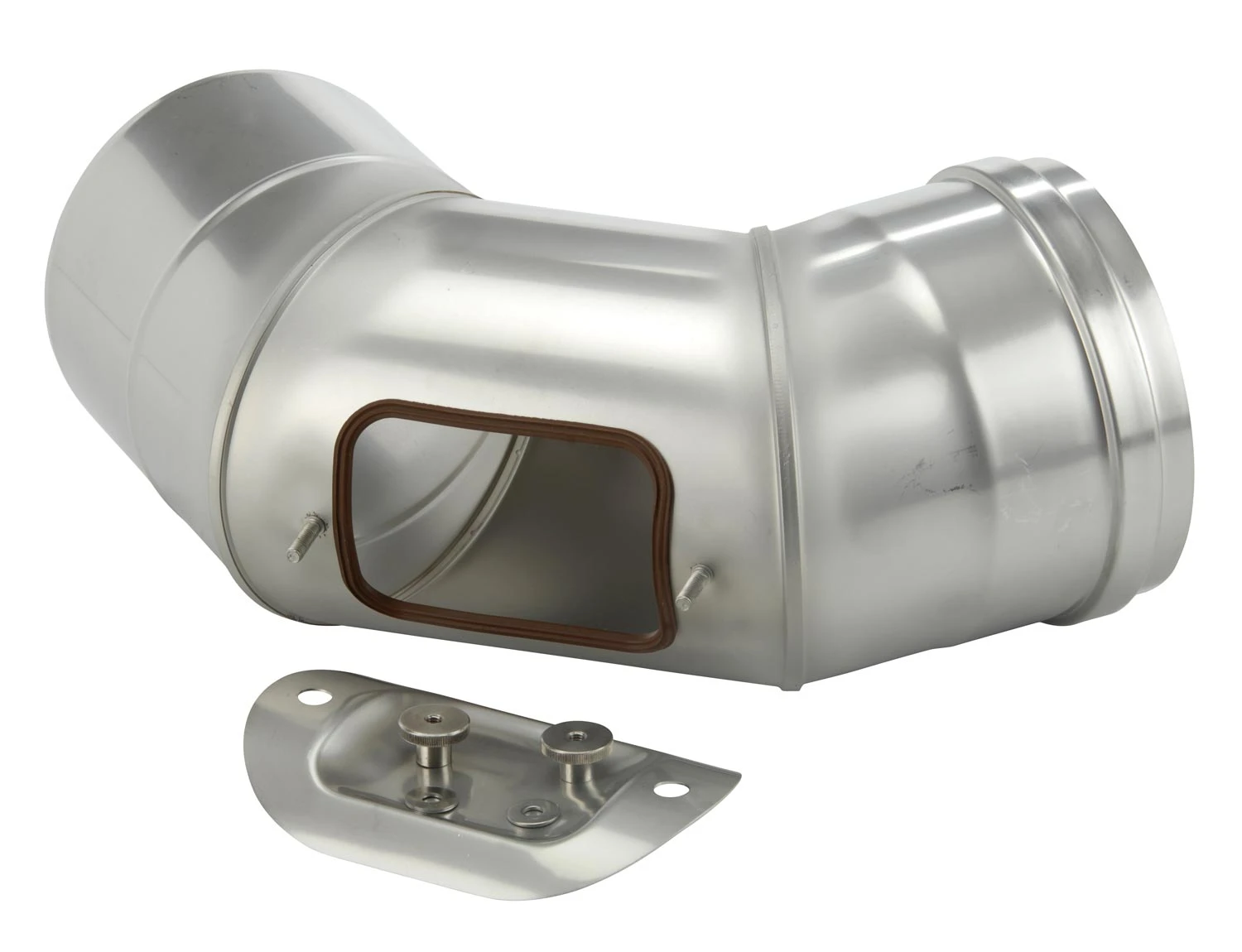 Einwandiger Schornstein Winkel in wählbaren Querschnitten 80 – 400 mm mit Prüföffnung aus hochwertigen V4A Edelstahl in der Materialstärke: 0,6 mm (1,0 mm auf Anfrage) zur Kontrolle und Prüfung der Schornsteinanlage durch den Schornsteinfeger