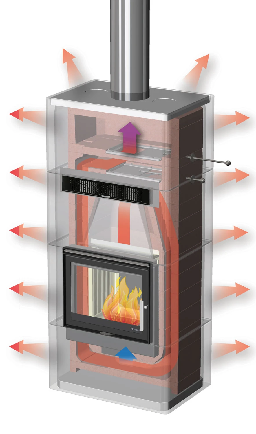 Der Salzburg L + 1 Konvektion vereint die Vorteile eines klassischen Kaminofens mit denen angenehmer Strahlungswärme durch Speicherofentechnik. Die Spezialisten von Nordpeis entwickelten ein Modell, welches beiden Bedürfnissen nachkommt. Zu einem dem Wunsch nach langanhaltender Wärme und zum anderen eine schnelle Wärmeabgabe.